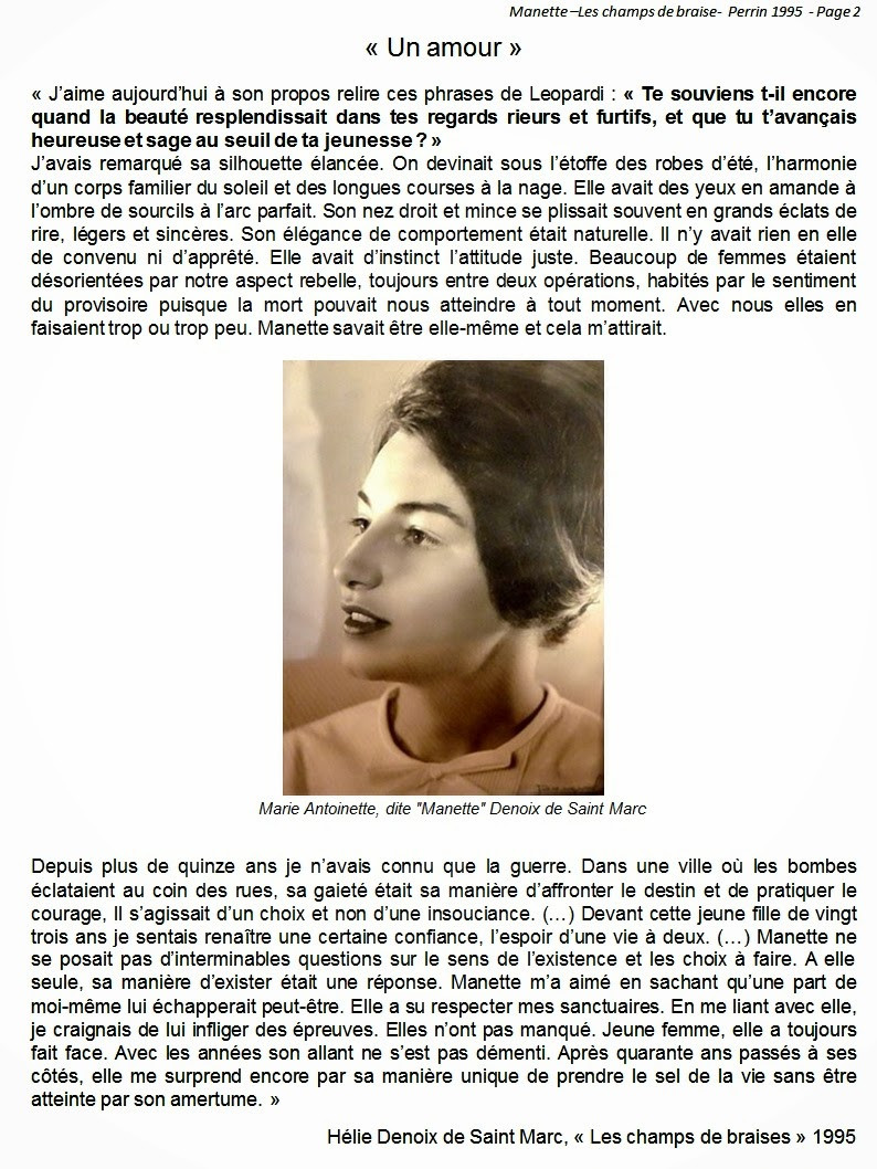 Marie-Antoinette DENOIX de SAINT-MARC, épouse du Chef de Bataillon Elie DENOIX de SAINT-MARC (+), est décédée le 26 décembre à Lyon dans sa 92° année. Ses obsèques seront célébrés le mercredi 31 décembre à 11h00 en l'église de La Garde Adhémar (26700). La messe sera suivie de l'inhumation dans le caveau familial du cimetière de La Garde Adhémar, où repose son mari, le Chef de bataillon de Saint-Marc, depuis 2013.