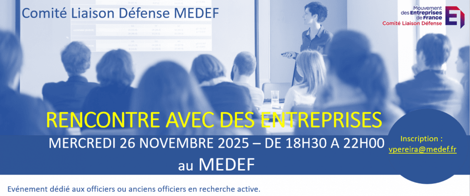 L'inscription impérative se fait auprès de Véronique PEREIRA (sg-cld@medef.fr). Nous vous recommandons d'arriver vers 18h15 pour permettre le début à 18h30 précises.