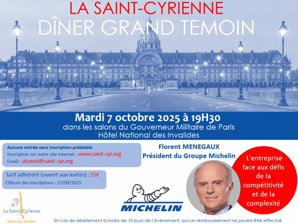Le mardi 7 octobre 2025, La Saint-Cyrienne aura l’honneur de recevoir dans le cadre de son prochain Dîner Grand Témoin, le Président du Groupe Michelin, Florent Menegaux. Le sujet d'intervention sera le suivant : l'entreprise face aux défis de la compétitivité et de la complexité.