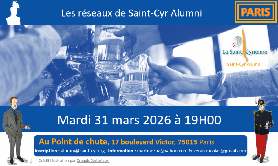 Le prochain afterwork Saint-Cyr Alumni se tiendra le mardi 31 mars dès 19h. Il se tiendra au Point de chute, 17 boulevard Victor (75015)